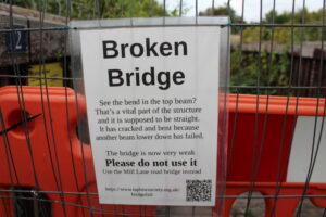 The timber footbridges over a waterway (the Jubilee River) are rotting. Some are unsafe and have been closed. The footbridges need to be replaced but the question is ‘who pays’?