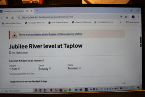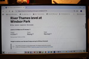 Today the River Thames is rising and the Taplow flow control structure on the Jubilee River is being operated to divert flood water away from Windsor, Eton and Maidenhead. These actions affect water levels downstream. Today’s date happens to be 27/1/2026 and below is a record (a snapshot) of the graphical detail available at that time. Please note that if you follow the links below – the graphs will be different because time has moved on.
